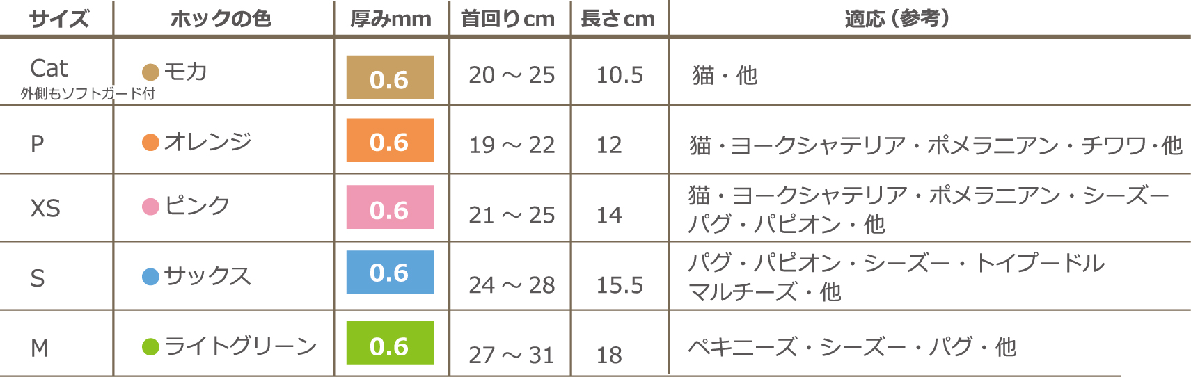 頭の丸い小型犬や猫向きのワイドタイプです。 厚さ0.6mmの通常タイプです。 Catは外側にもソフトガードがついています。 サイズ表ワンツーカラ-Cat&ワイド Cat ワンツーカラ-Cat&ワイド P ワンツーカラ-Cat&ワイド XS ワンツーカラ-Cat&ワイド S ワンツーカラ-Cat&ワイド M